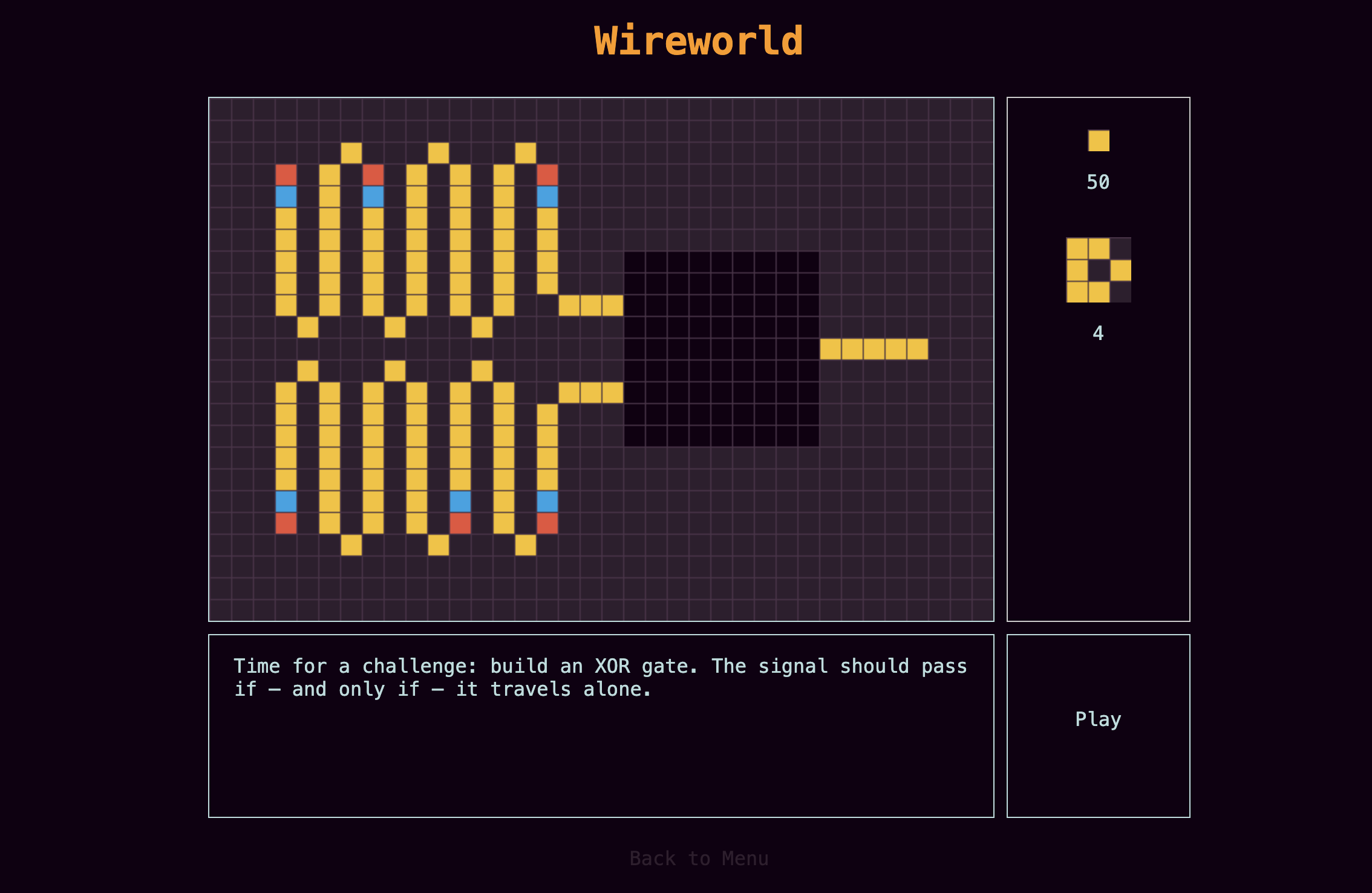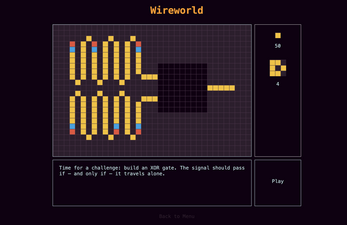 This is a puzzle game build around the wireworld celullar automaton. Solve the challenges and see how simple rules can lead to more and more complex behavior. Is this the fabric the universe is made of?